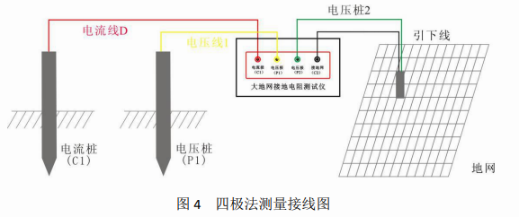 四極法測量時,從地網的地樁上引出二根連接線分別接到儀器的電壓極P2、接地網 C2 兩接線柱,然后按測量操作步驟進行測試。四極法測量時儀器會自動消除接線誤差。